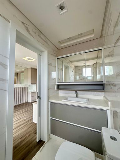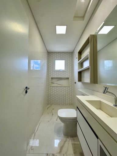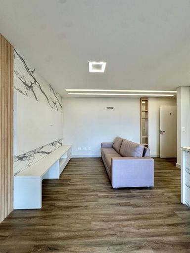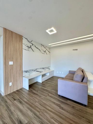 Sala para 02 ambientes com móveis planejados, banheiro social.