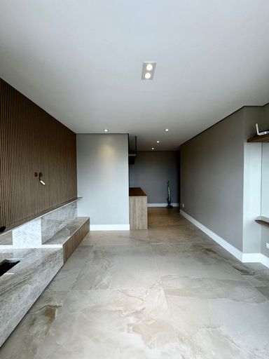 •Sala em conceito aberto com toque de elegância, lareira a gás revestida com Mármore Taj Mahal.