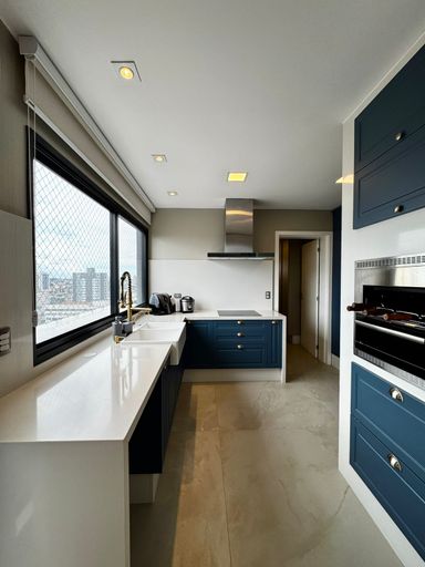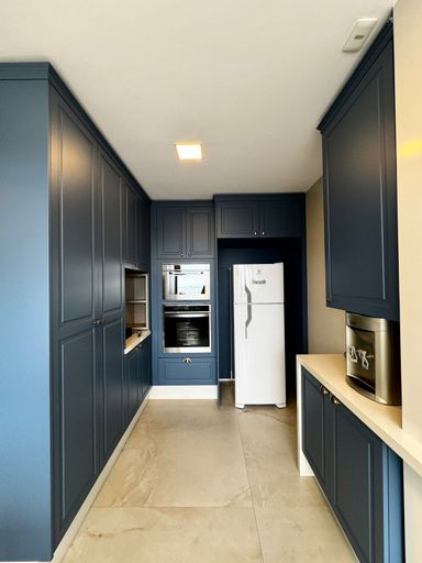 •Cozinha planejados em estilo provençal, móveis em lava azul, bancadas em pedra Silestone White, Cuba branca com triturados de alta potência;