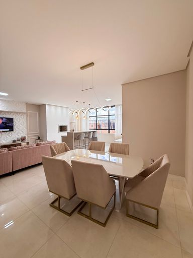 Sala de jantar gourmet com churrasqueira;