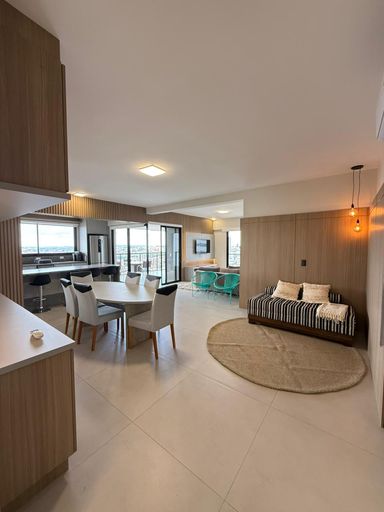 Apartamento Mobiliado 02 Dormitórios, sendo 01 com armários planejado cama de casal, painel, ar condicionado sala, com sofá retrátil , painel, espelho, ar condicionado, mesa com banquetas Sacada com Churrasqueira Cozinha com armários planejado, geladeira Área de serviço com armários Porta com fechadura Digital