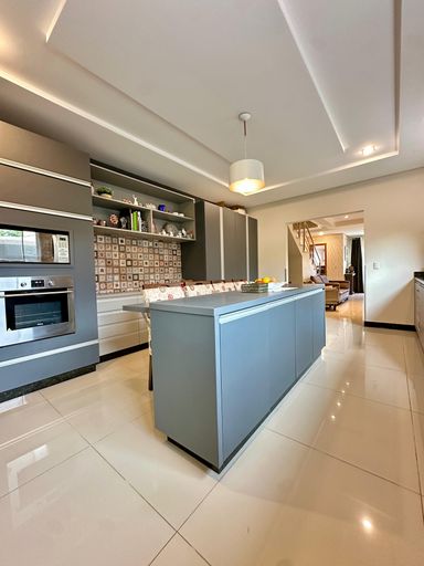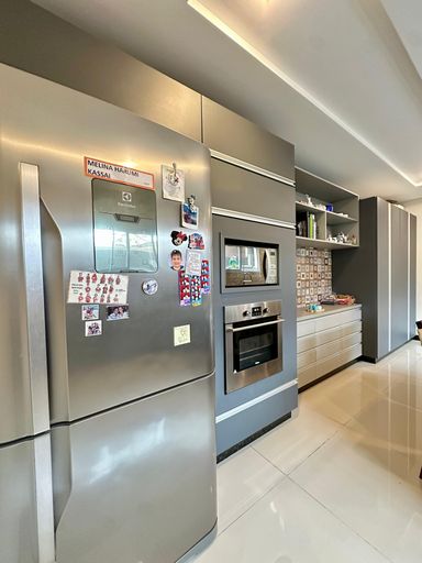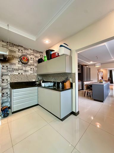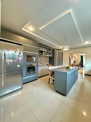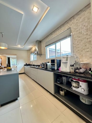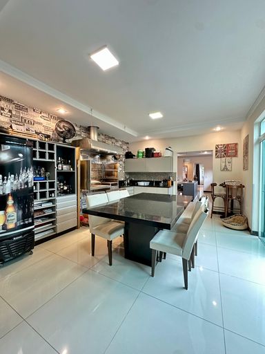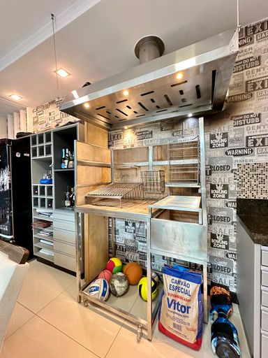 Cozinha ampla e área gourmet com churrasqueira parrilla, ambos mobiliados