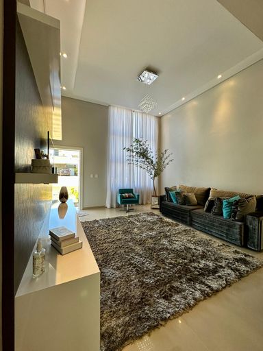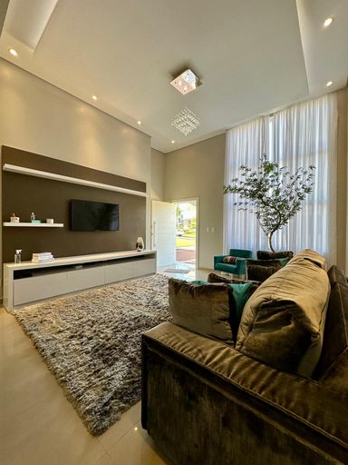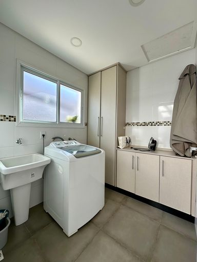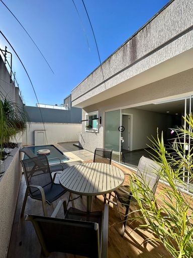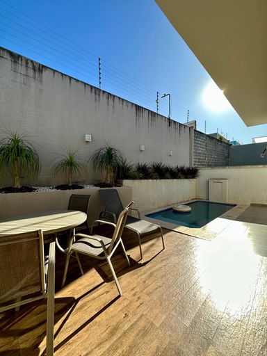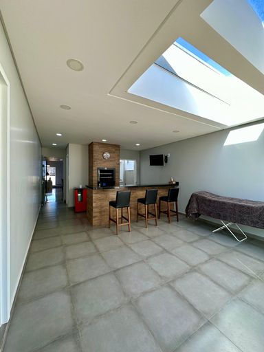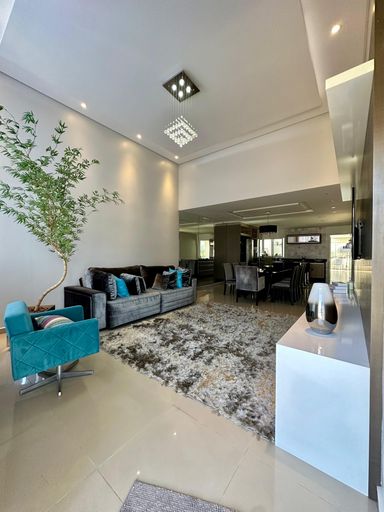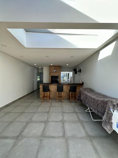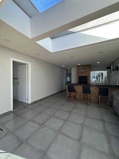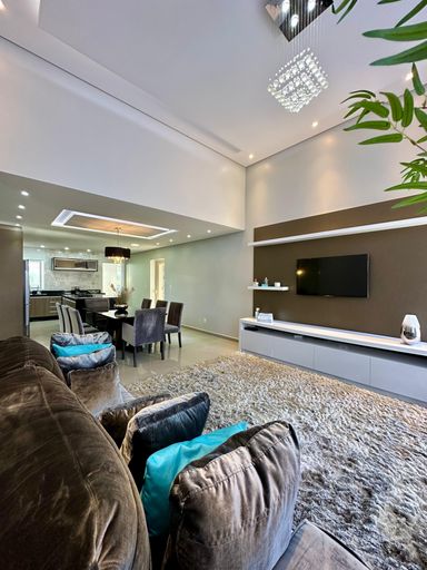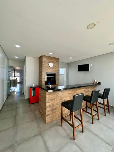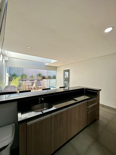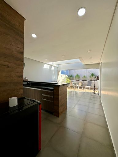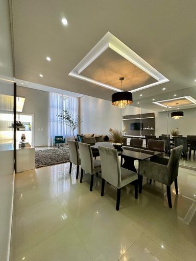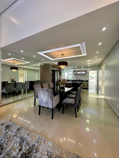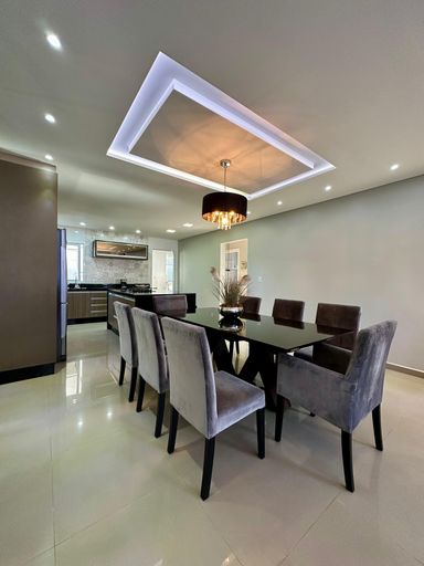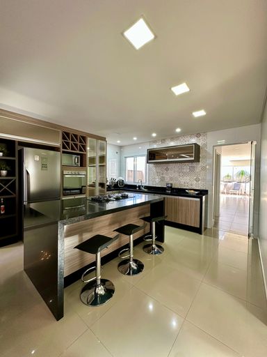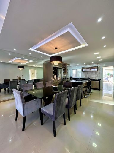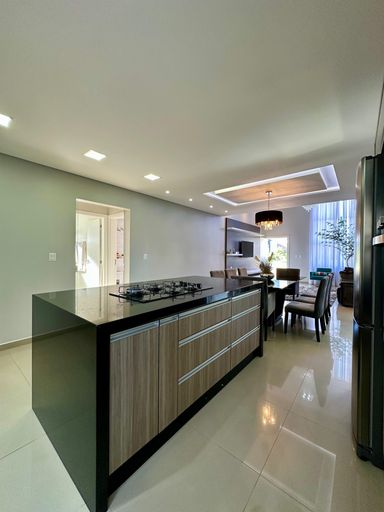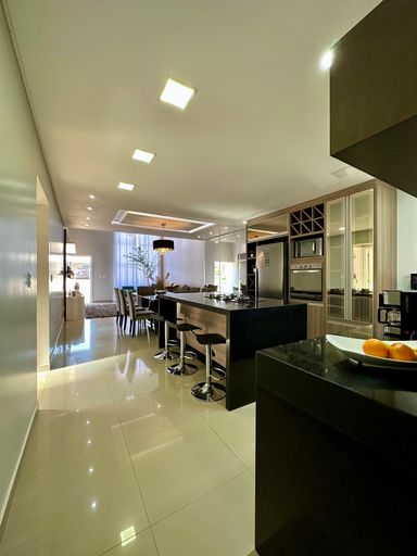 Sala de jantar com mesa integrada à cozinha com planejados e eletros