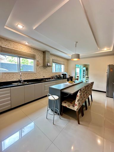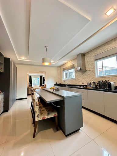 Cozinha ampla e área gourmet com churrasqueira parrilla, ambos mobiliados